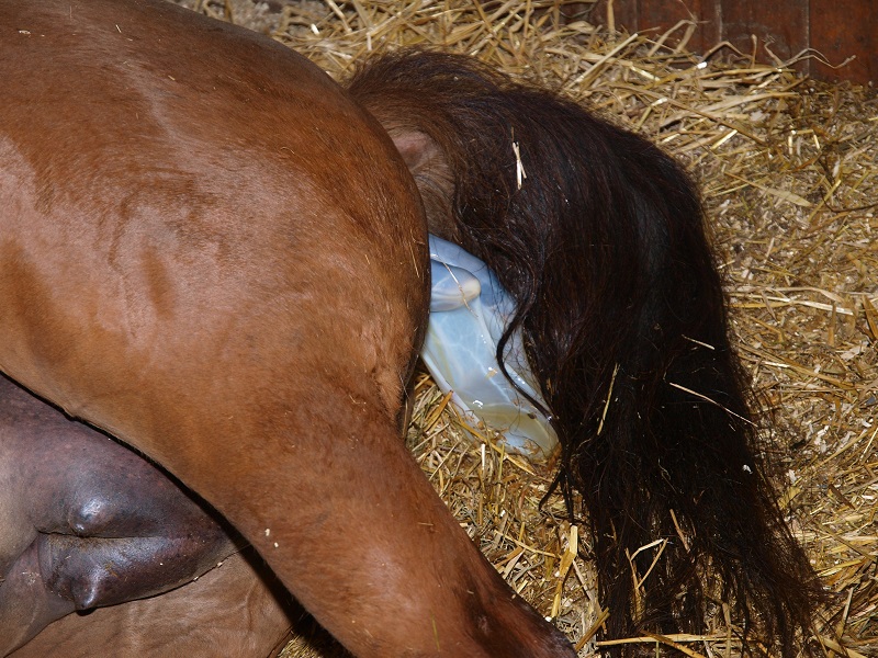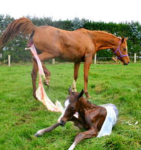 Las patas traseras del potro pueden permanecer en la vagina de la yegua durante varios minutos, en este tiempo permite al feto recibir sangre esencial de la placenta a través del cordón umbilical y no debe ser interrumpido. En la mayoría de los casos, el tiempo desde la ruptura del alantochorion hasta el período de reposo después del parto se completa en minutos, pero un intervalo de 10 a 60 minutos se considera normal.