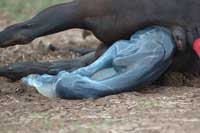 En este último estadío del parto, las estructuras anatómicas finales se muestran envueltas en placenta y la yegua puede quedarse postrada por instantes y voltea para ver a su cría.
